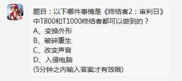 以下哪件事情是终结者2审判日中T800和T1000终结者都可以做到?终结者2审判日12.22每日一题答案、是不是还有好多小伙伴不知道呢?那些还知道的快来和小编一起看看吧以下哪件事情是终结者2审判日中T800和T1000终结者都可以做到?A、变换外形B、破碎重生C、改变声音D、入侵电脑(5分钟之内输入