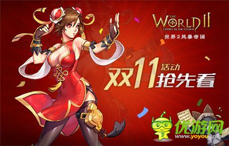 双十一狂欢,精彩抢先看!《世界2》将于11月6日下午进行数据更新,届时双十一系列活动也将同时开启,海量稀有材料、大批神秘道具任性送,更有特级宝箱大酬宾、双倍巅峰斗魂等超级福利活动。《世界2》用心和礼邀你度过双十一,这个光棍节不再孤单!《世界2》双十一活动具体信息:【活动】双十一系列活动。通过节日任务