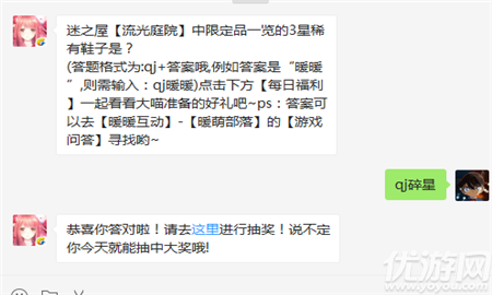 迷之屋【流光庭院】中限定品一览的3星稀有鞋子是?奇迹暖暖微信公众号每日一题答题玩法每天都会进行不同的题目考验玩家对游戏的熟悉程度,回答正确的答案后能获得游戏给玩家提供的大量奖励,今天的答案在游戏中可以发现。奇迹暖暖2019年1月11日每日一题问题迷之屋【流光庭院】中限定品一览的3星稀有鞋子是?(答案