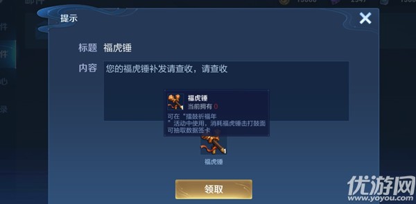 王者荣耀福虎锤是什么?很多召唤师都在今天收到了官方通过邮件发送的「福虎锤」道具,但并不知道这个道具有什么作用,其实这是一个活动道具但活动尚未开启。下面就是王者荣耀福虎锤作用介绍了,大家一起来看看吧!王者荣耀福虎锤是什么有很多玩家可能都注意到了今天在王者荣耀邮箱中收到了关于福虎锤的邮件。这个邮件应该是