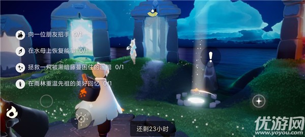 光遇11.10任务怎么做?sky光遇国服今天更新的4个每日任务是:向一位玩家招手、在水母上恢复能量、拯救一只被黑暗藤蔓困住的遥鲲、在雨林重温先祖的美好回忆。大家在刷任务的时候还可以顺便收集季节蜡烛,额外的大蜡烛则位于禁阁地图中。光遇11.10任务怎么做今日任务:每日任务领取位置改到遇境神坛石像。1、