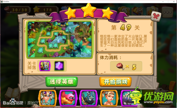 原始守卫战第49关怎么过?原始守卫战第49关过关技巧?接下来小编为大家详解一下:先展示一下这关,并且使用的是这几个英雄,我已经三星通关了。开局先造图腾塔,升到三级,放毒,接着在图上的位置造出箭塔,放凯,一样造了升到三级。毒和箭塔三级之后再图上位置造元素,同样直升三级。接下来我是先满毒,又满箭,最后满