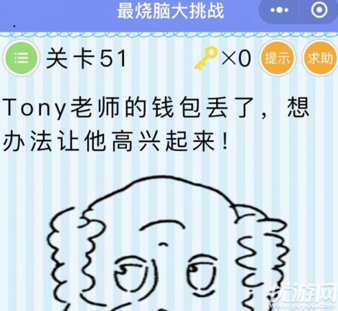 微信最烧脑大挑战第51关怎么过,Tony老师的钱包丢了,想办法让他高兴起来!这一关卡的答案也是非常简单的,相信以各位小伙伴的智力都知道怎么通关吧,小编这就为大家分享下微信最烧脑大挑战第51关答案,一起来看看!微信最烧脑大挑战第51关答案Tony老师的钱包丢了,想办法让他高兴起来把手机倒过来拿着,难过