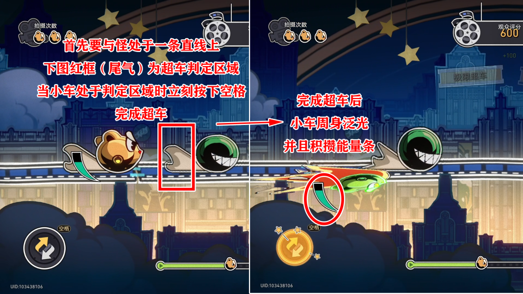 操作:超车(按空格)——>成功超车(周身发光)——>撞敌人(再按一次空格),所以相当于连续按了两下空格