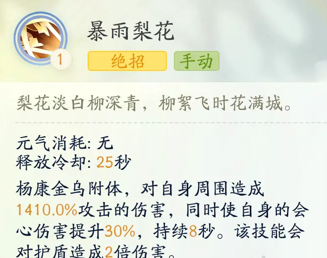 2、绝招-暴雨梨花:对周围造成大量的范围伤害,提高自己的会伤,且若敌人有护盾,伤害翻倍。