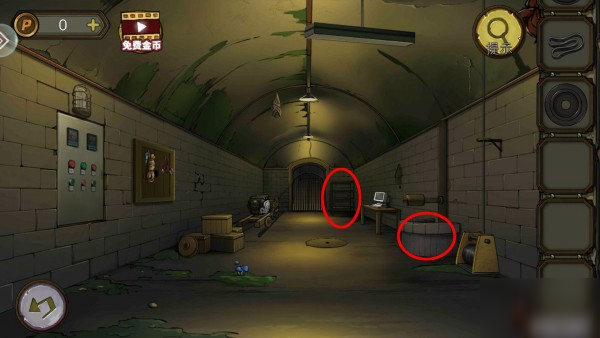 红、绿按钮放机关上,点亮所有按钮,开启防空洞的灯。拿车轮,墙上拿到钥匙、绳子和电线。
