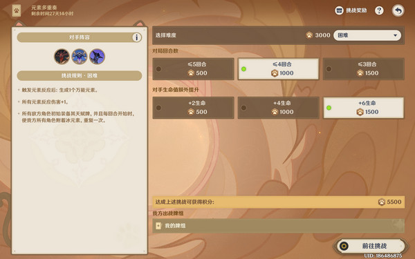 难度选择「困难」,对局回合数选择「≤4回合」,对手生命值额外提升选择「+6生命」。