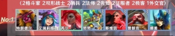 2、羁绊组成: 2格斗家、2双形战士、2哨兵、2法师、2先知、2征服者、2极客、1外交官