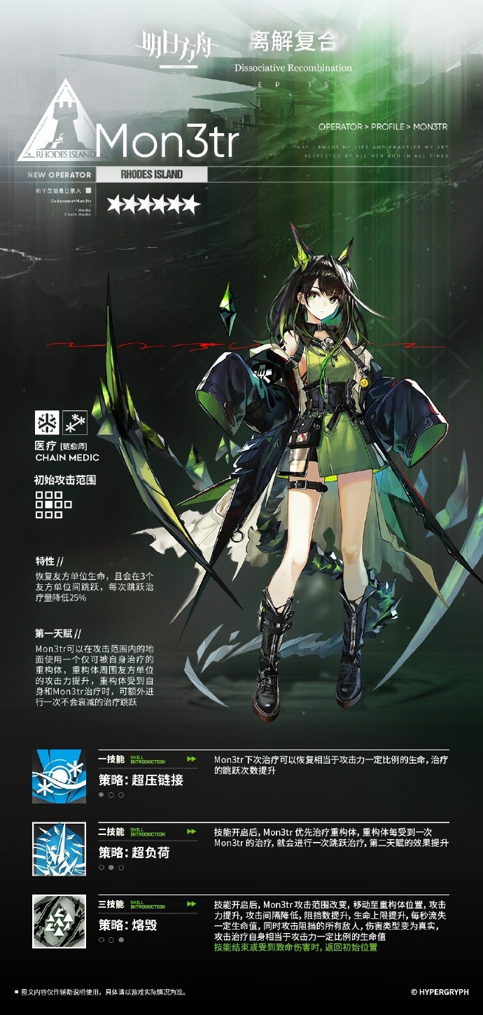 三技能:技能开启后,Mon3tr的攻击范围改变,移动到重构体的位置,攻击力提升,攻击间隔降低,阻挡数提升,生命上限提升,每秒流失一定生命值,同时攻击阻挡的所有敌人,伤害类型变成真实伤害,攻击治疗自身相当于攻击力一定比例的生命值(技能结束或者受到致命伤害的时候,返回到初始位置)