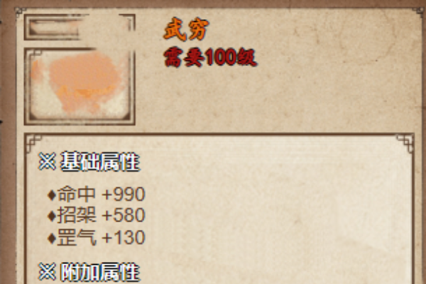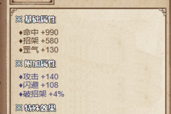 2、它的基础属性是,命中+990,招架+589,罡气+130,还有附加属性攻击+140,闪避+108,破招架+4%。