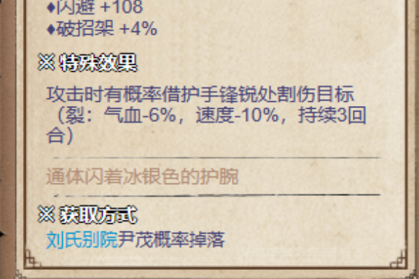 在烟雨江湖中,武穷是通过闪着冰银色的护腕,获得方式是刘氏别院击败尹茂随机获取,需要玩家注意的是玩家等级需要达到100级才能获取装备,还具有特殊效果攻击时有一定几率割伤目标。