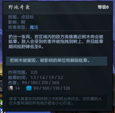范围325,比大屁股不加天赋的捆要小一圈,这个技能的机制是把范围内的敌方单位聚合并捆到一棵树上,而且捆到哪棵树上其实也是可以选择的