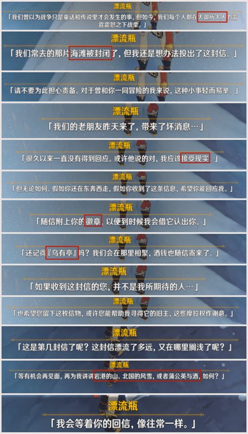 首先,我们可以从碎片中得知,漂流瓶不只发出了三个。我们拾取到的或许只是众多漂流瓶中的几个,而漂流瓶的主人是想通过这种方式寻找一个音讯全无的友人。其中【战争】与【大御所大人的雷霆号之怒】说明了漂流瓶的主人处于战乱之中,无法亲自去大陆其他地方寻找他的友人。或许也只有这样,才能理解他丢出一个又一个瓶子的用意。