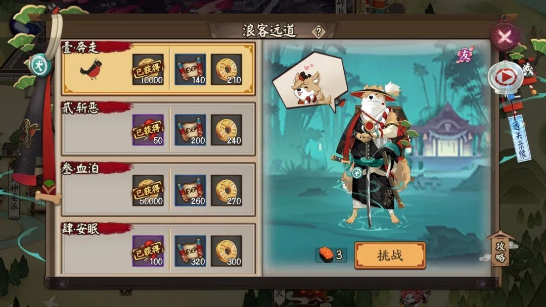 新增挑战副本——犬神秘闻副本「浪客远道」。通关第8、9、10层更有四星奉为达摩、御行达摩和犬神新「山林野犬」可以获取。